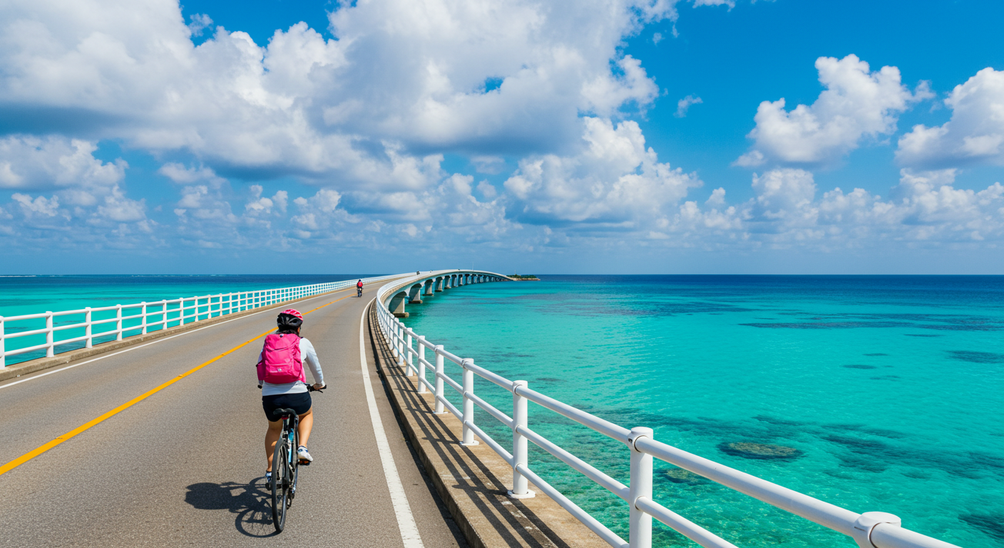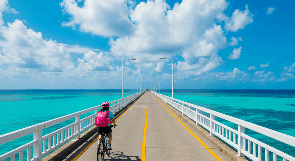 伊良部大橋は、無料で通行できる橋としては日本で最も長い3,540mを誇り、橋の中央部から見えるコバルトブルーの海のパノラマは圧巻です。車では味わえない、風を肌で感じながら走る感動は格別で、多くのサイクリストが「人生で一度は体験したい絶景」と称しています。