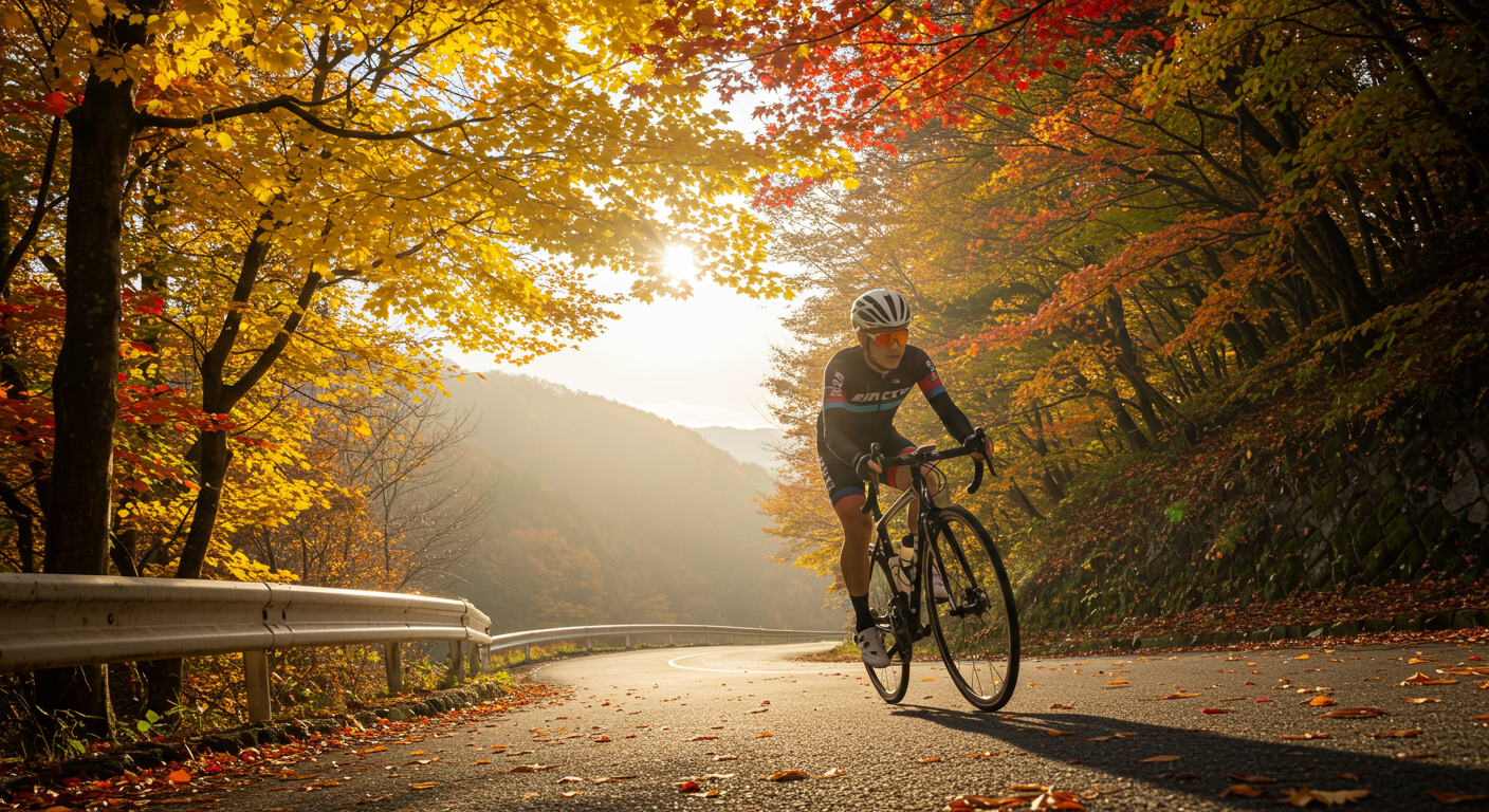 服装については重ね着システムが基本で、ベースレイヤー(メリノウールまたは合成素材の吸湿発散材)、ミッドレイヤー(軽量フリースまたはサイクリングジャージ)、アウターレイヤー(防風・防水ジャケット)を準備します。春・秋の涼しい気候では長袖サイクリングジャージまたはジャケット、サイクリングタイツまたはレッグウォーマー付きショーツ、軽量グローブ、防水ジャケットが必要です。
