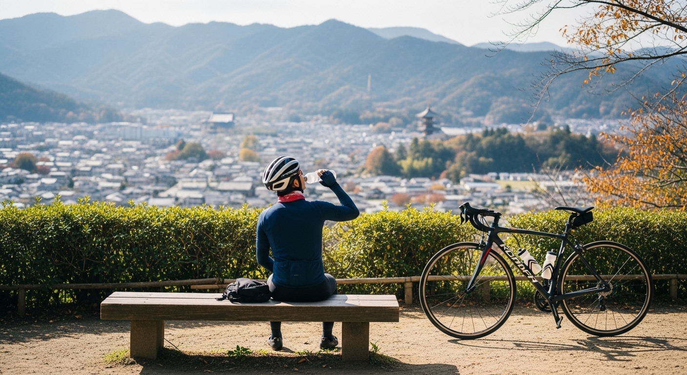 持ち物としては、補給食(羊かんなど)、盗難防止の鍵、パンク修理道具を持参することをおすすめします。特にサイクリングをする際、最も重要な持ち物はパンク修理用の工具セットです。暑い日は熱中症対策の水分・電解質補給タブレット、日焼け対策の日焼け止めを忘れないようにしてください。その他、ドリンク、フェイスタオル、日焼け対策用品、サングラス(夏は特に重要)、手袋(肌寒い時期)なども準備しておくと良いでしょう。