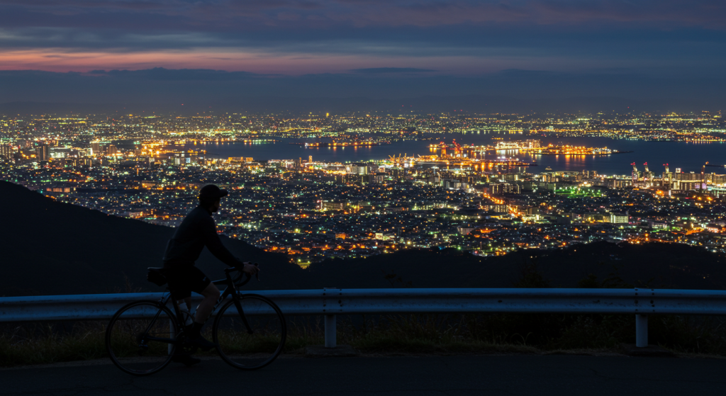 サイクリング後に夜景を楽しむベストな時間帯は、18時〜19時の「マジックアワー」です。この時間帯は夕日が沈み、街の明かりが段階的に灯り始める最も美しい瞬間を体験できます。昼から夜への移り変わりをゆっくりと眺めながら、サイクリングの疲れを癒すことができます。
