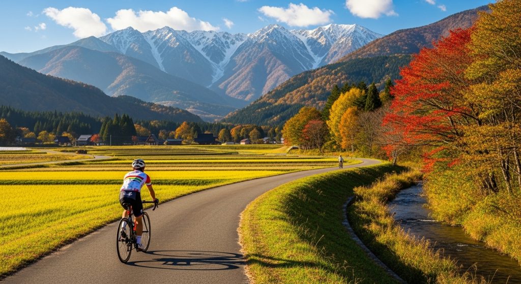 長野県白馬村は、秋になると北アルプスの雄大な山々と色鮮やかな紅葉が織りなす絶景が広がる、国内屈指の紅葉スポットです。特にサイクリングコースを走りながら楽しむ紅葉は、車では味わえない特別な体験となります。ペダルを漕ぎながら秋風を感じ、五感すべてで白馬の自然を満喫できるのがサイクリングの魅力です。白馬の紅葉の見頃は、標高差によって9月下旬から11月上旬まで約1か月半にわたって楽しむことができます。高山帯の栂池自然園や八方池では9月下旬から色づき始め、麓の大出公園や青木湖では10月中旬から11月上旬が最も美しい時期となります。この長い紅葉シーズンにより、訪れる時期を選ばず、必ずどこかで見頃の紅葉に出会えるのが白馬の大きな魅力です。さらに白馬では、山頂の新雪の白、中腹の紅葉の赤と黄、麓の常緑樹の緑が同時に見られる「三段紅葉」という奇跡的な光景が広がります。この三段紅葉は10月下旬から11月上旬にかけて最も美しく、多くの写真家やサイクリストが訪れる理由となっています。本記事では、初心者から上級者まで楽しめるサイクリングコースの詳細、紅葉の見頃時期、レンタサイクル情報、服装のアドバイスまで、白馬で紅葉サイクリングを満喫するための完全ガイドをお届けします。