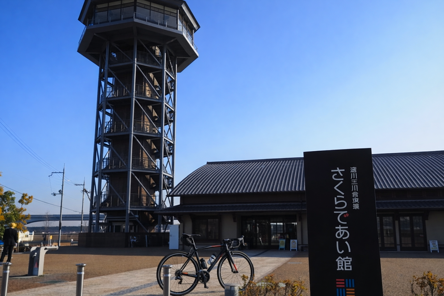 さくらであい館は、桂川サイクリングロードの終点(折り返し点)として機能する施設で、八幡市の淀川河川公園・背割堤地区に位置しています。桂川、宇治川、木津川の三川合流地点を見下ろす高さ約25メートルの展望塔がシンボルとなっており、サイクリストの到達目標として親しまれています。
